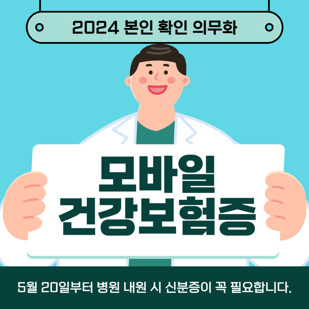 5월 20일부터 건강보험 본인 확인 의무화 제도가 시행됩니다. 병원, 의원에서 건강보험 급여가 적용되는 진료 등을 받을 때에는 신분증 등으로 본인확인을 하여야 건강보험 급여를 적용받을 수 있습니다. 신분증을 별도로 가지고 다닐 필요 없이 모바일 건강보험증 발급으로 간편하게 병원진료 보시길바랍니다.